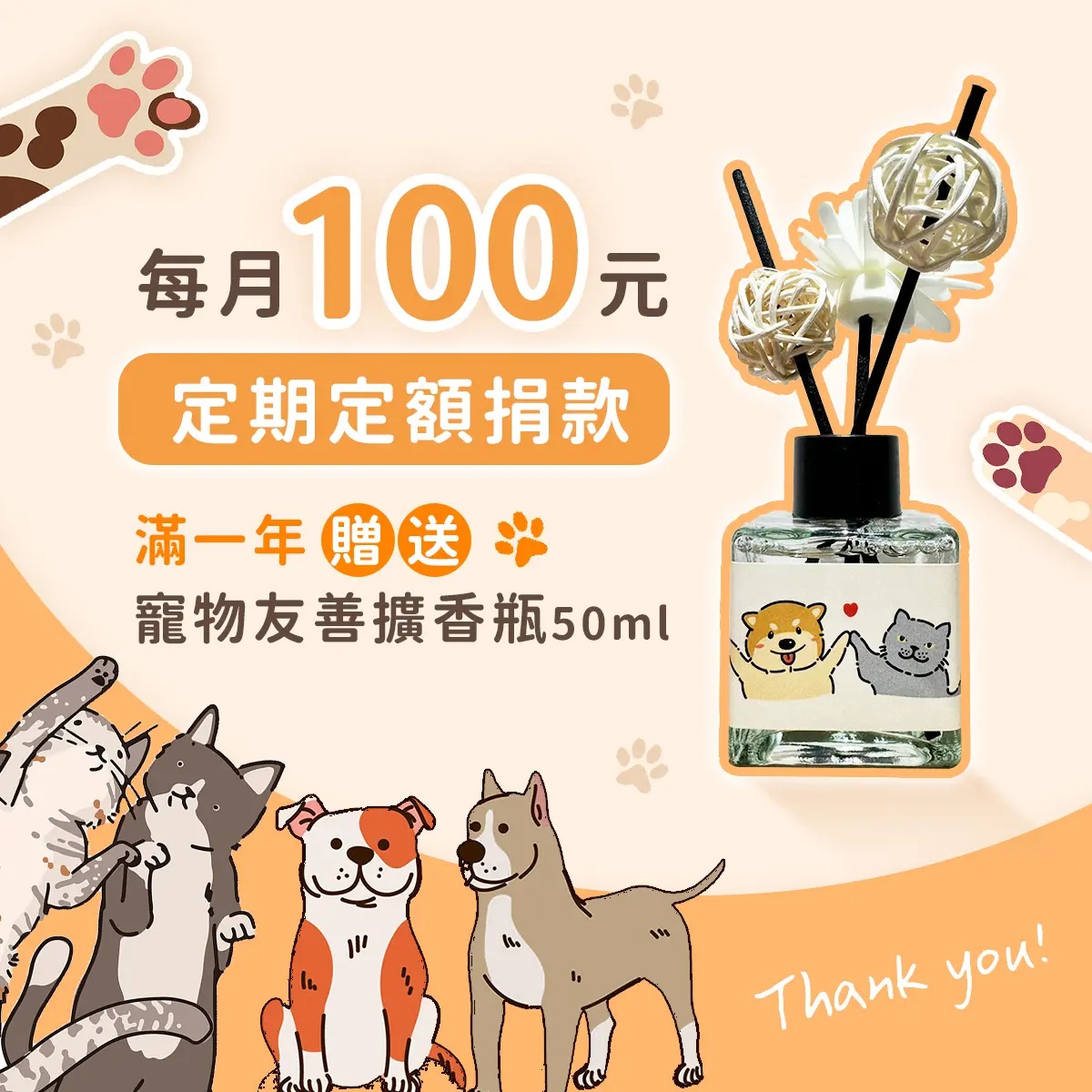 定期定額捐款100元12期或單筆捐款1000元即贈寵物友善擴香瓶(50ML)1瓶